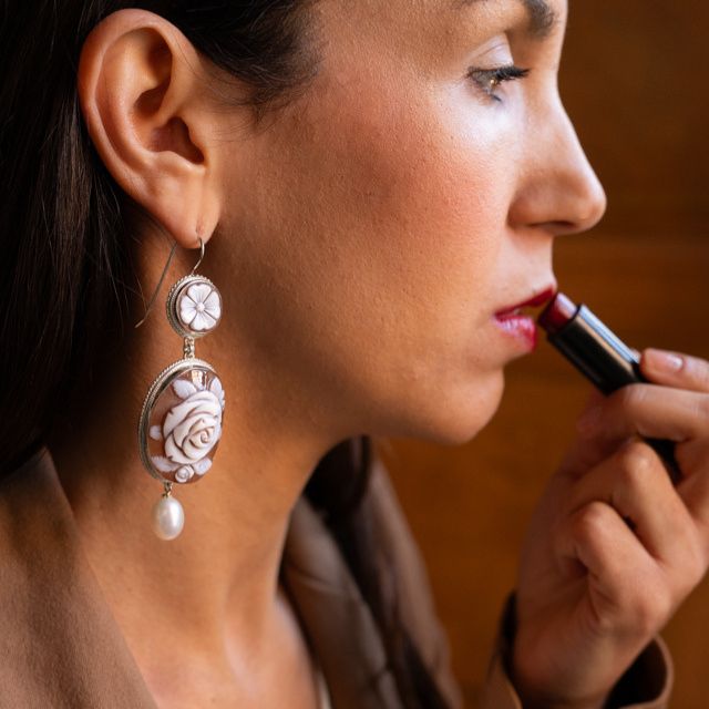 Orecchini in argento 925 ad amo con 4 cammei incisi a mano e perle di acqua dolce.