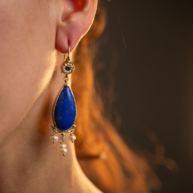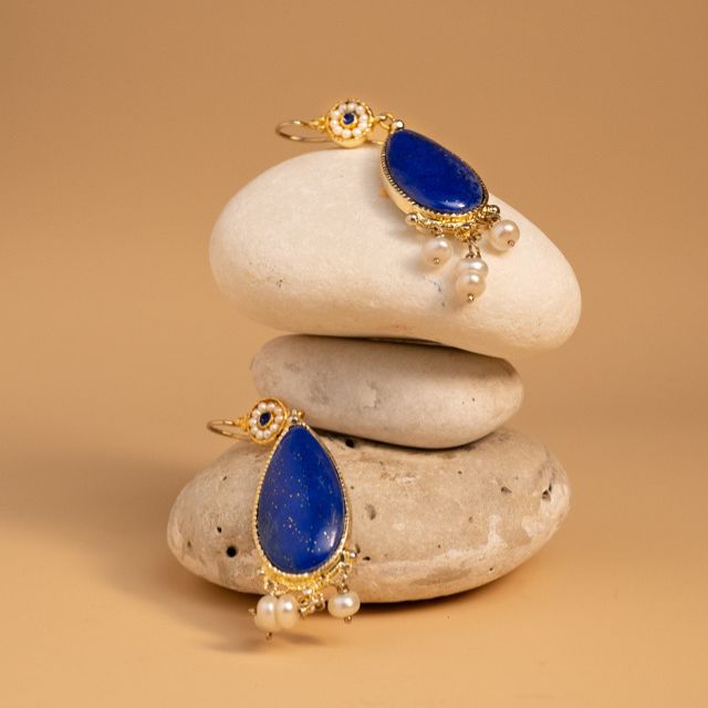 Orecchini in argento 925 placcato oro giallo lapislazzuli perle di acqua dolce ad amo.