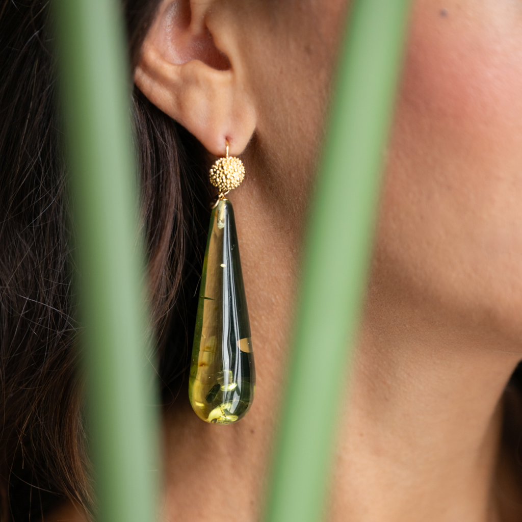 Orecchini in argento placcato oro giallo ad amo con ambra verde messicana.