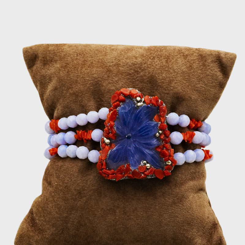 Meraviglioso bracciale elastico in calcedonio e corallo rosso italiano a tre fili, al centro calcedonio lavorato e contornato di corallo. Realizzato interamente a mano dai nostri laboratori. Un pezzo unico selezionato per te da Bottega Etrusca, gioielleria a Pisa.